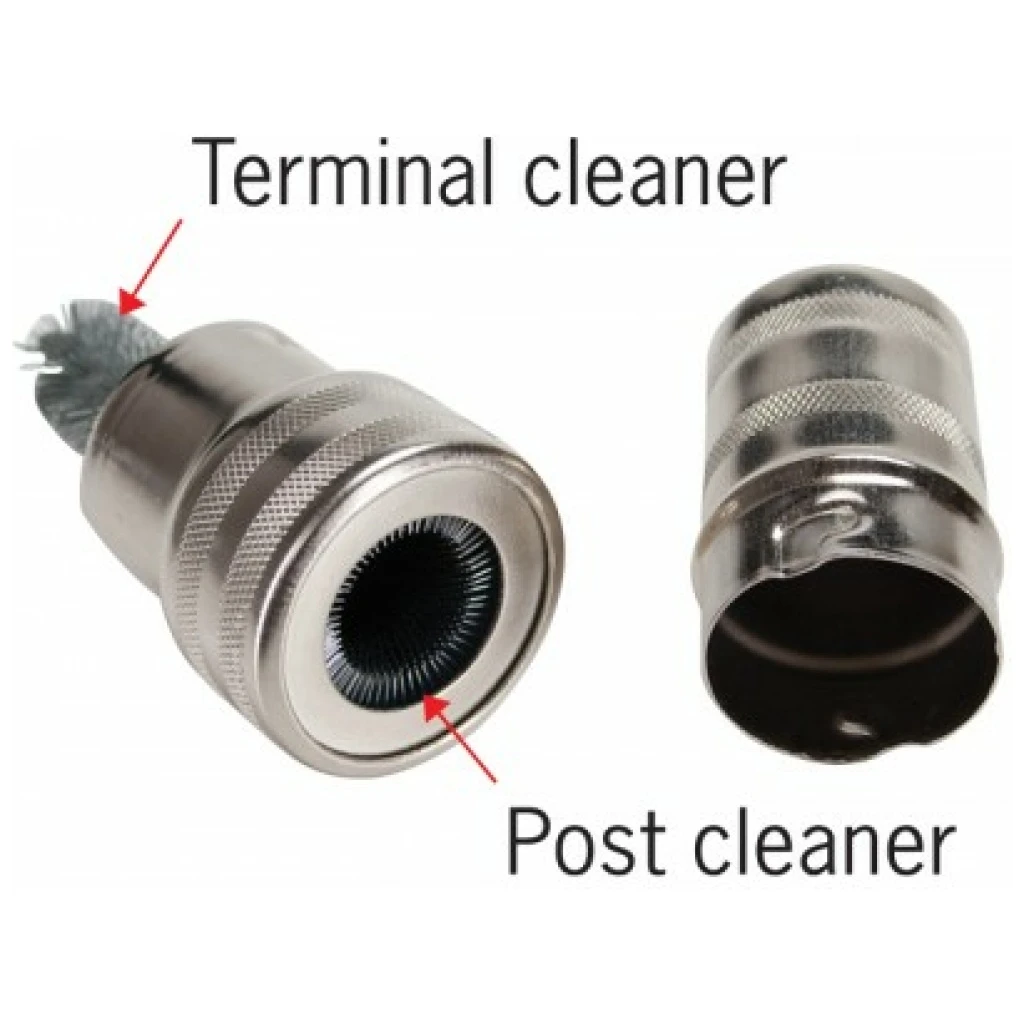 Battery top post and terminal cleaning tool with wire cleaning action.