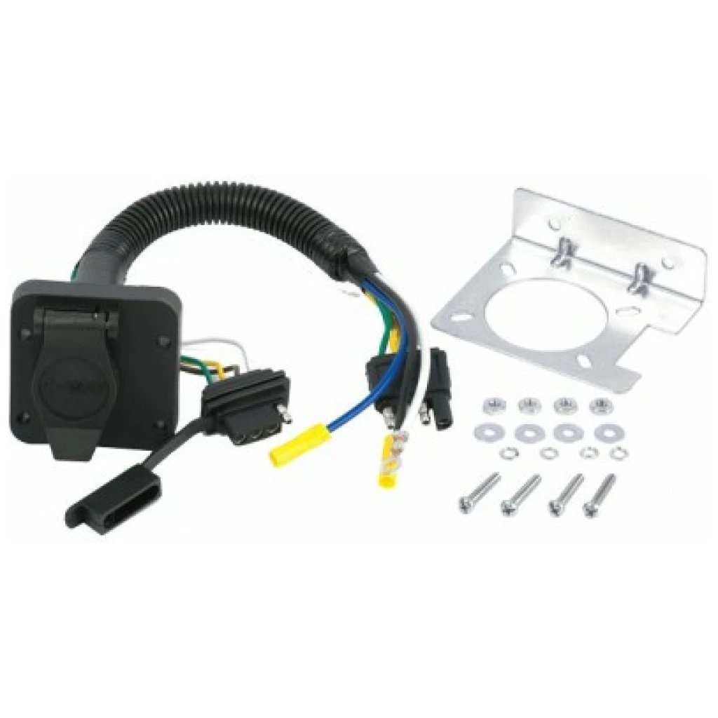 Adapts 4-way flat vehicle connector to accept a 6-way round trailer connector. Includes bracket and hardware, splices for brake controls, accessory lighting and electrical ground.
