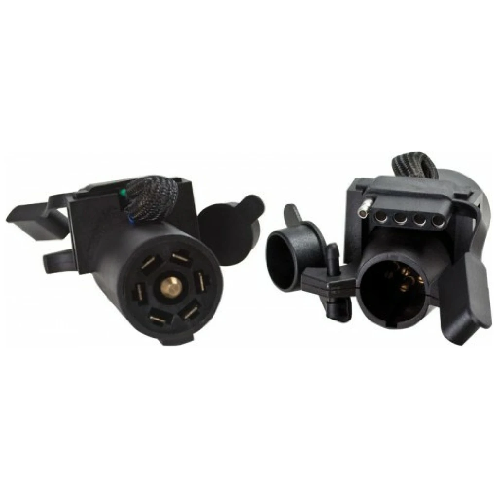 Adapts a 7-RV vehicle connector to accept a 6-way round, 4-way flat or 5-way flat trailer connector.